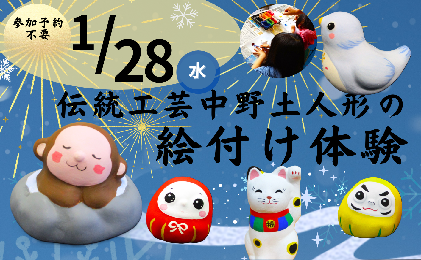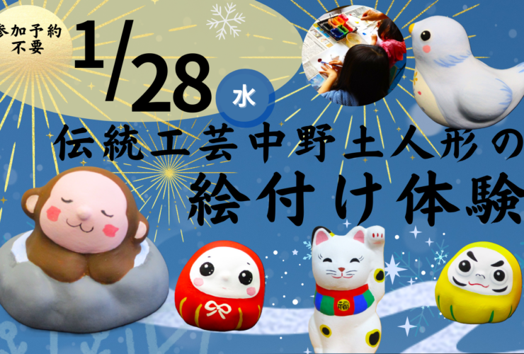 1月28水曜日 つくる・まなぶ 中野土人形絵付け体験ワークショップ 中野土人形の魅力にふれる — 色をのせて、福を呼ぶ体験 伝統工芸の“いま”と旅の思い出がひとつになる冬の体験。飯山駅観光案内所で開...