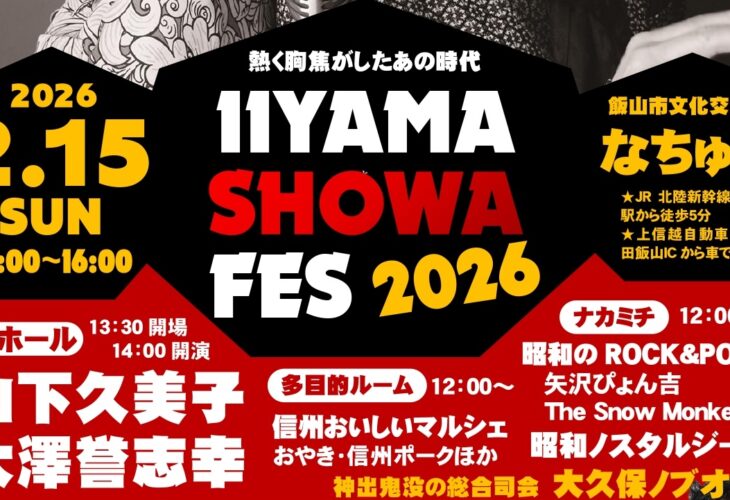 2月15日曜日 みる・きく いいやまSHOWAフェス2026|昭和音楽と文化を飯山で あの頃の熱と、ときめきが飯山に帰ってくる。 カセットテープを巻き戻し、レコードに針を落としたあの時代。 1980年代・昭和の音楽と...