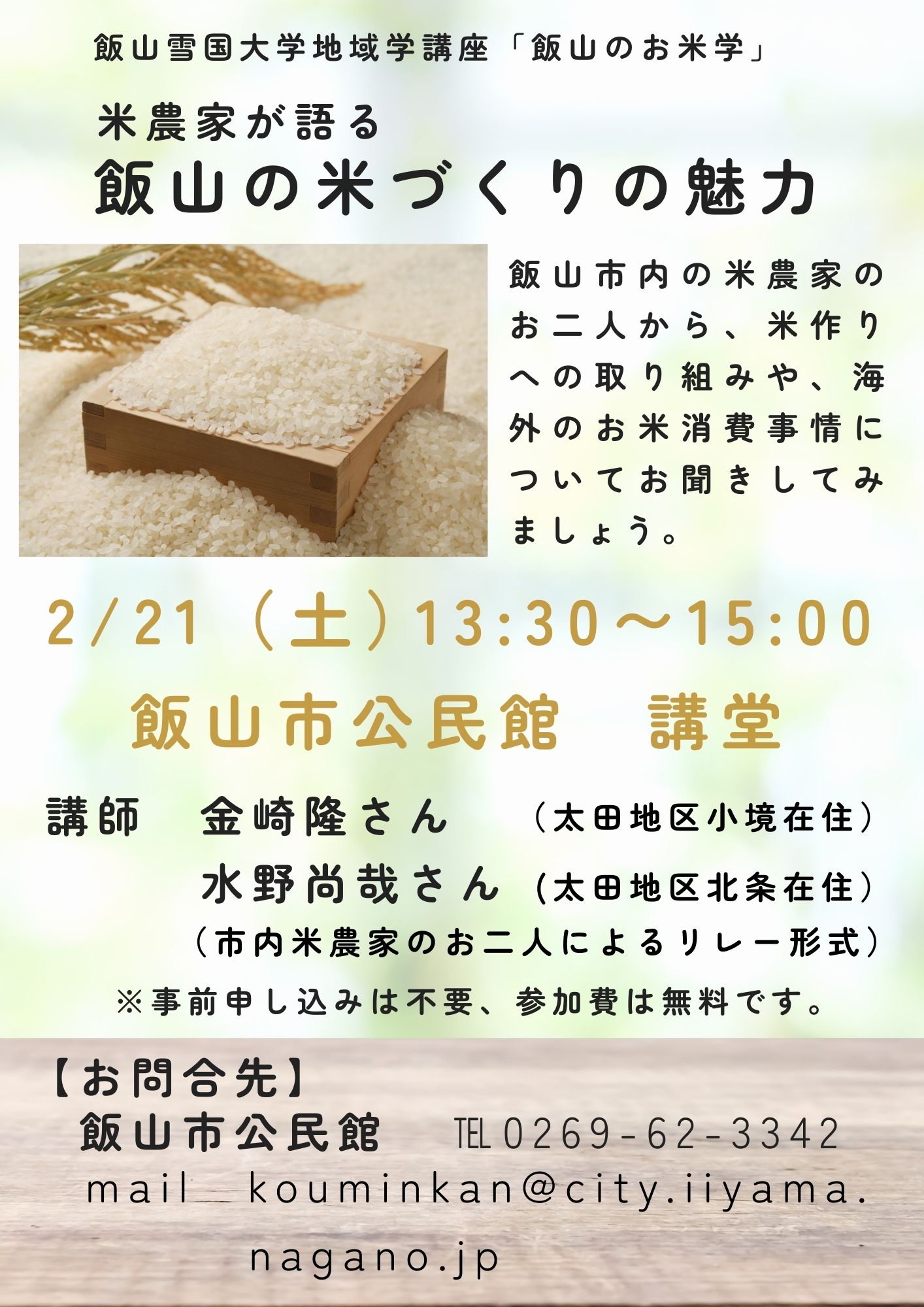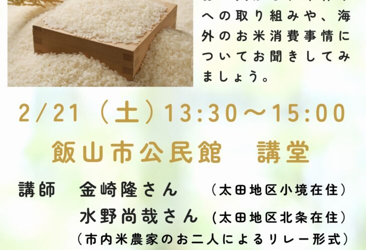2月21土曜日 お米 飯山のお米学「米農家が語る 飯山の米づくりの魅力」 日時 2月21日(土) 13:30~15:00 場所 飯山市公民館 講堂 内容 飯山市内の米農家のお二人から、米作りへの取り組みや...