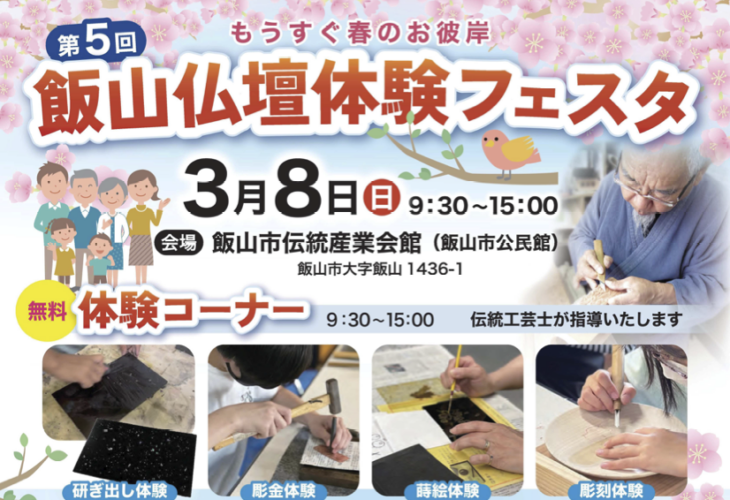 3月08日曜日 つくる・まなぶ 第5回 飯山仏壇体験フェスタ開催 もうすぐ春のお彼岸。飯山の伝統にふれる一日。 第5回「飯山仏壇体験フェスタ」が、3月8日(日)に開催されます。 会場は飯山市伝統産...
