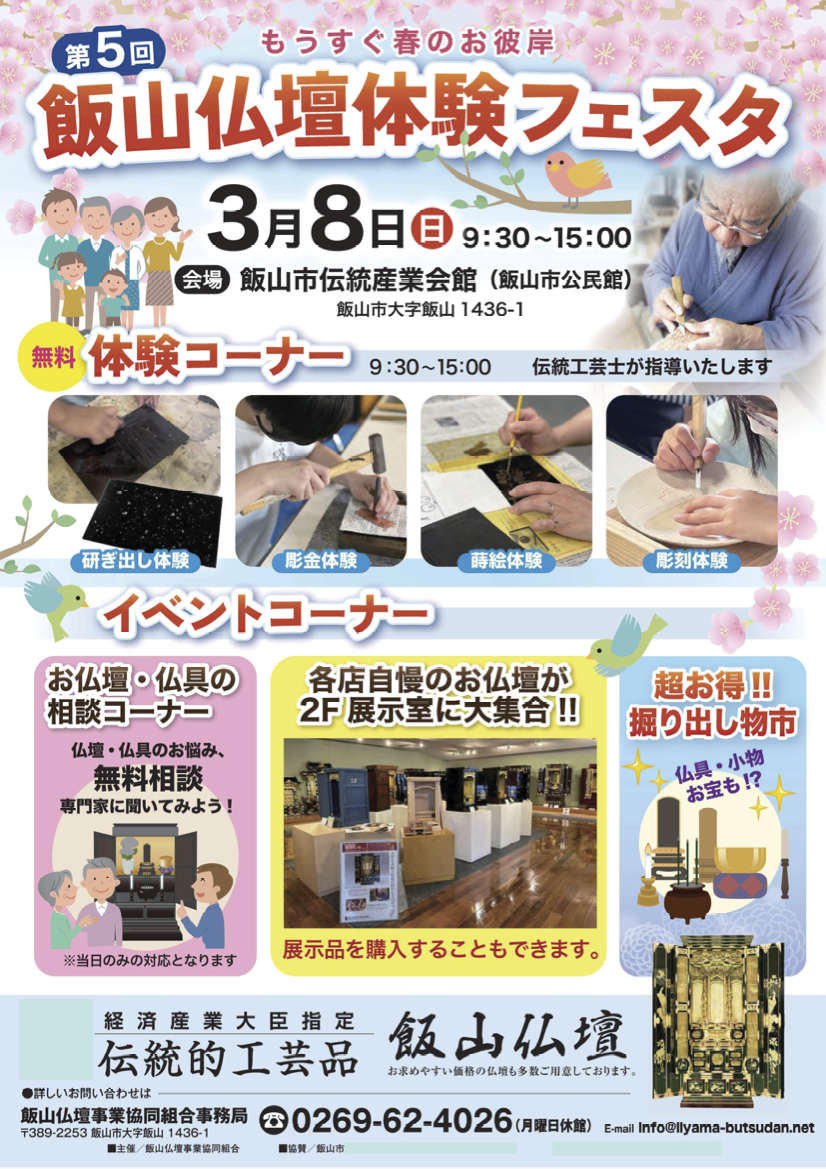 As the season turns toward spring and the days grow gently warmer, Iiyama invites you to encounter one of its most treasured traditional crafts. The 5th Iiyama Buddhist Altar Experience Festa offers a rare opportunity to see, touch, and learn about the refined artistry of Iiyama Butsudan. Guided by skilled local artisans, visitors of all ages can explore hands-on workshops, view beautifully crafted altars up close, and gain insight into a centuries-old tradition that continues to shape the cultural heart of the region.