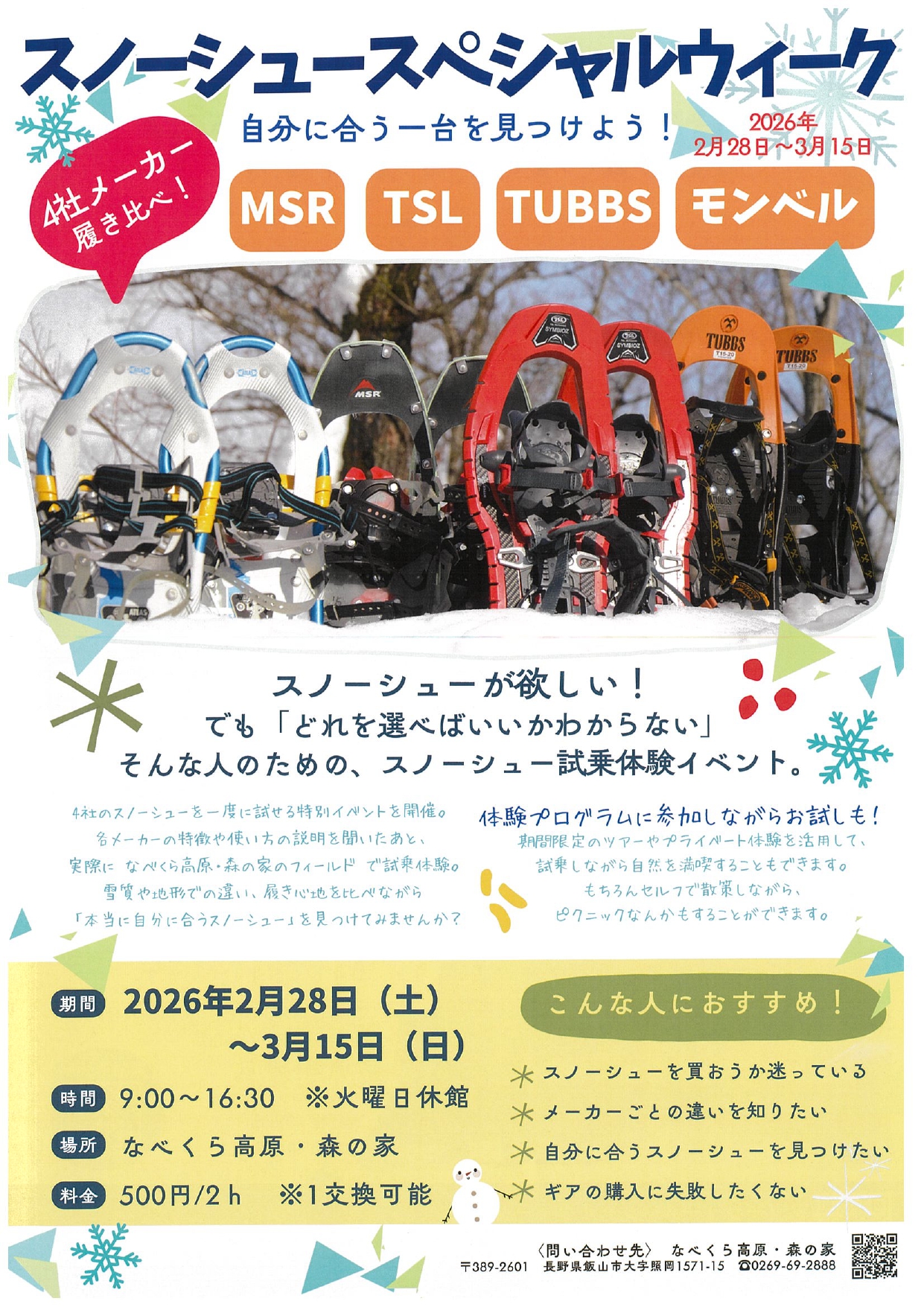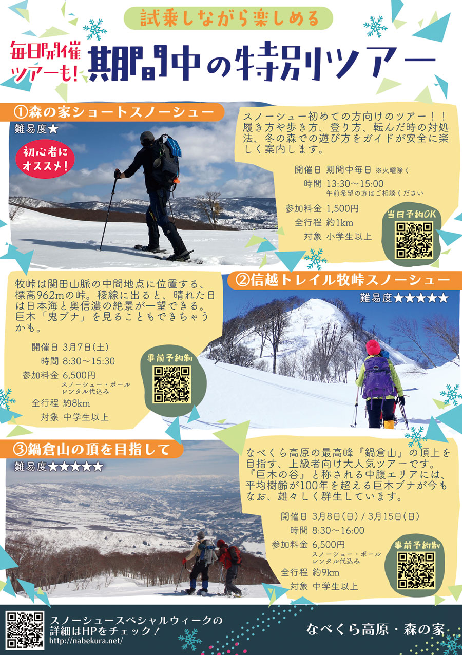 This winter, discover the joy of walking across fresh snow at Snowshoe Special Week 2026 in Iiyama. Over two weeks at the serene Nabekura Highlands, visitors can compare and test snowshoes from four leading brands—MSR, TSL, Tubbs, and Montbell—all in one place. Whether you are purchasing your first pair or refining your winter gear, this hands-on experience offers a rare opportunity to feel the differences for yourself in real mountain conditions.