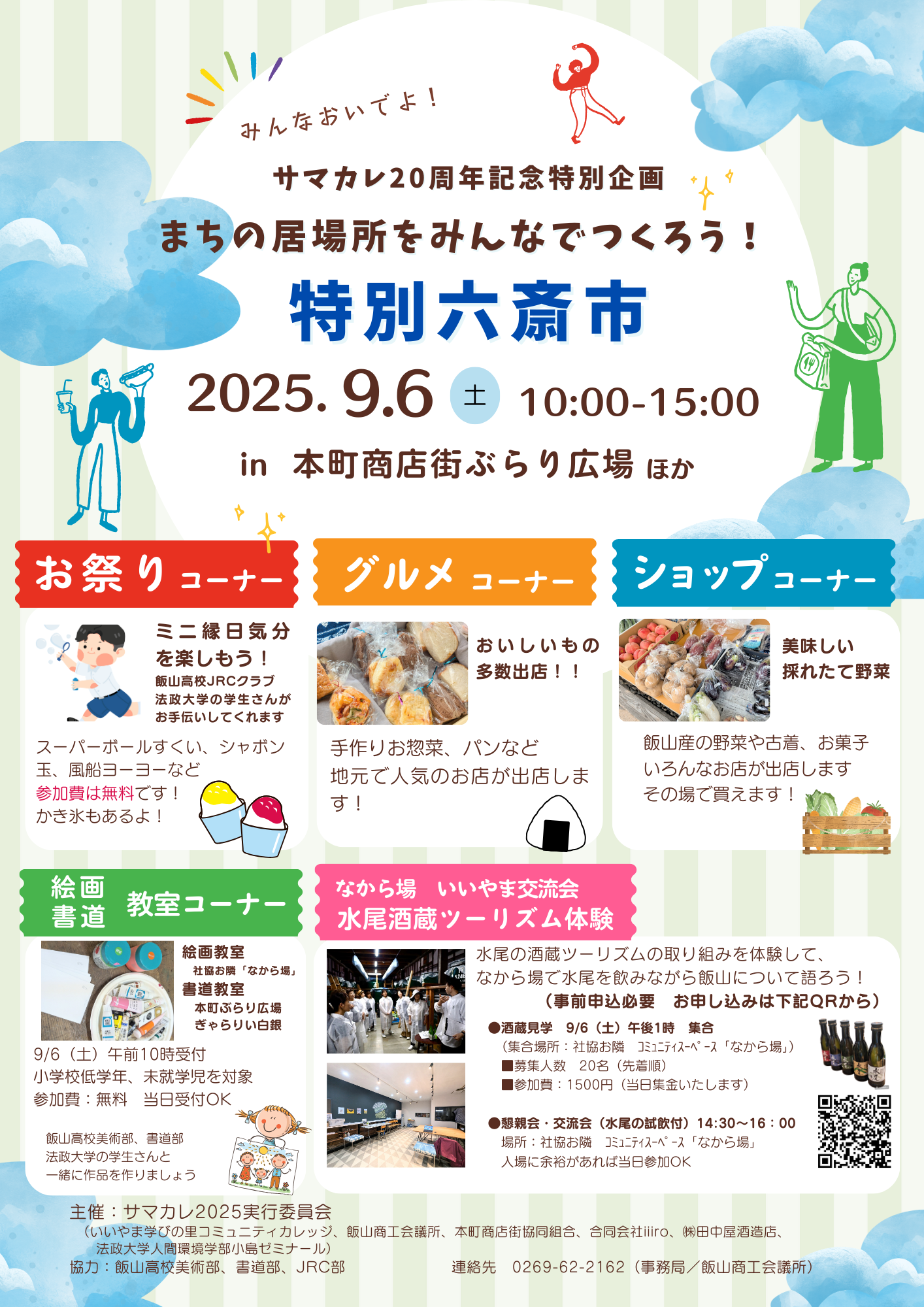 主催:サマカレ2025実行委員会(いいやま学びの里コミュニティカレッジ、飯山商工会議所、本町商店街協同組合、合同会社iiiro、(株)田中屋酒造店、法政大学人間環境学部小島ゼミナール)