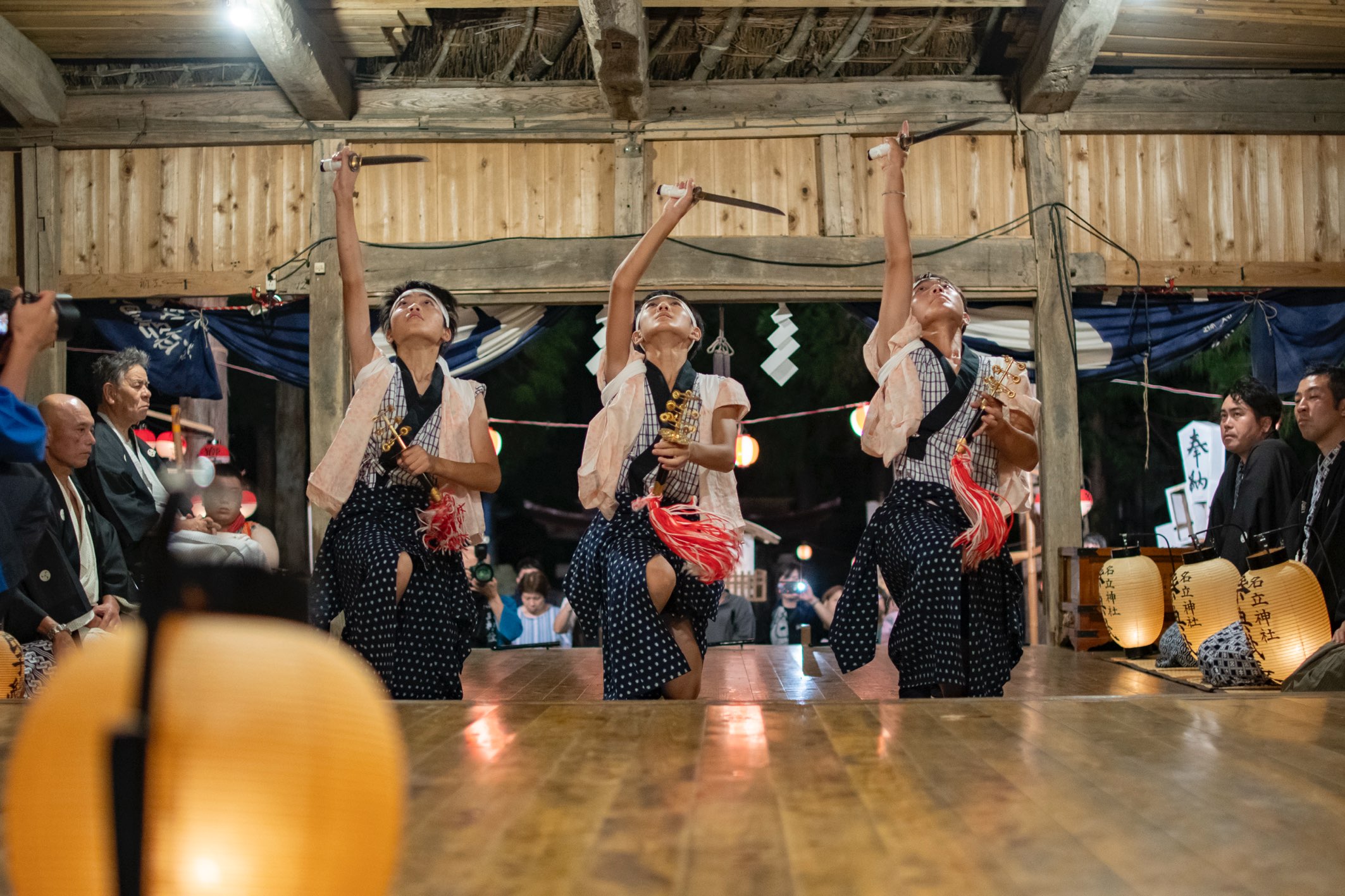 祭りの中でもとりわけ重要とされる「剣の舞」は、男子3人がゆっくりとした所作から始め、次第に激しく舞い上がる荘厳な舞です。