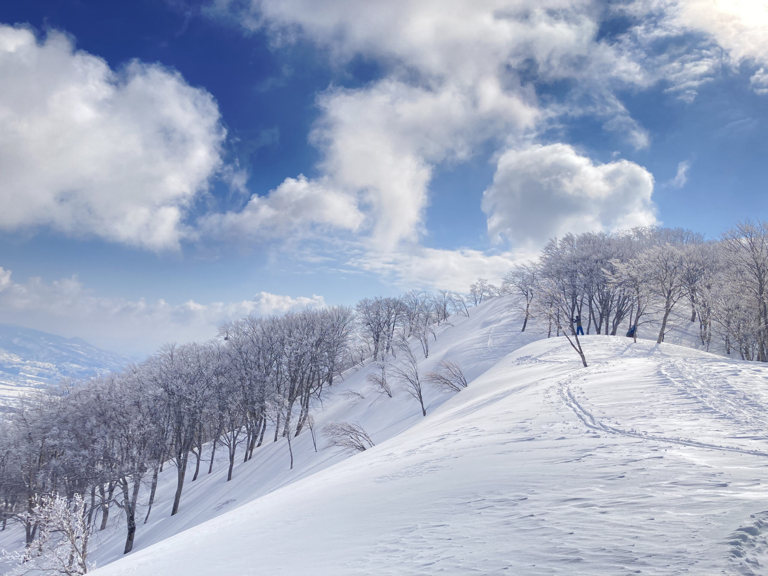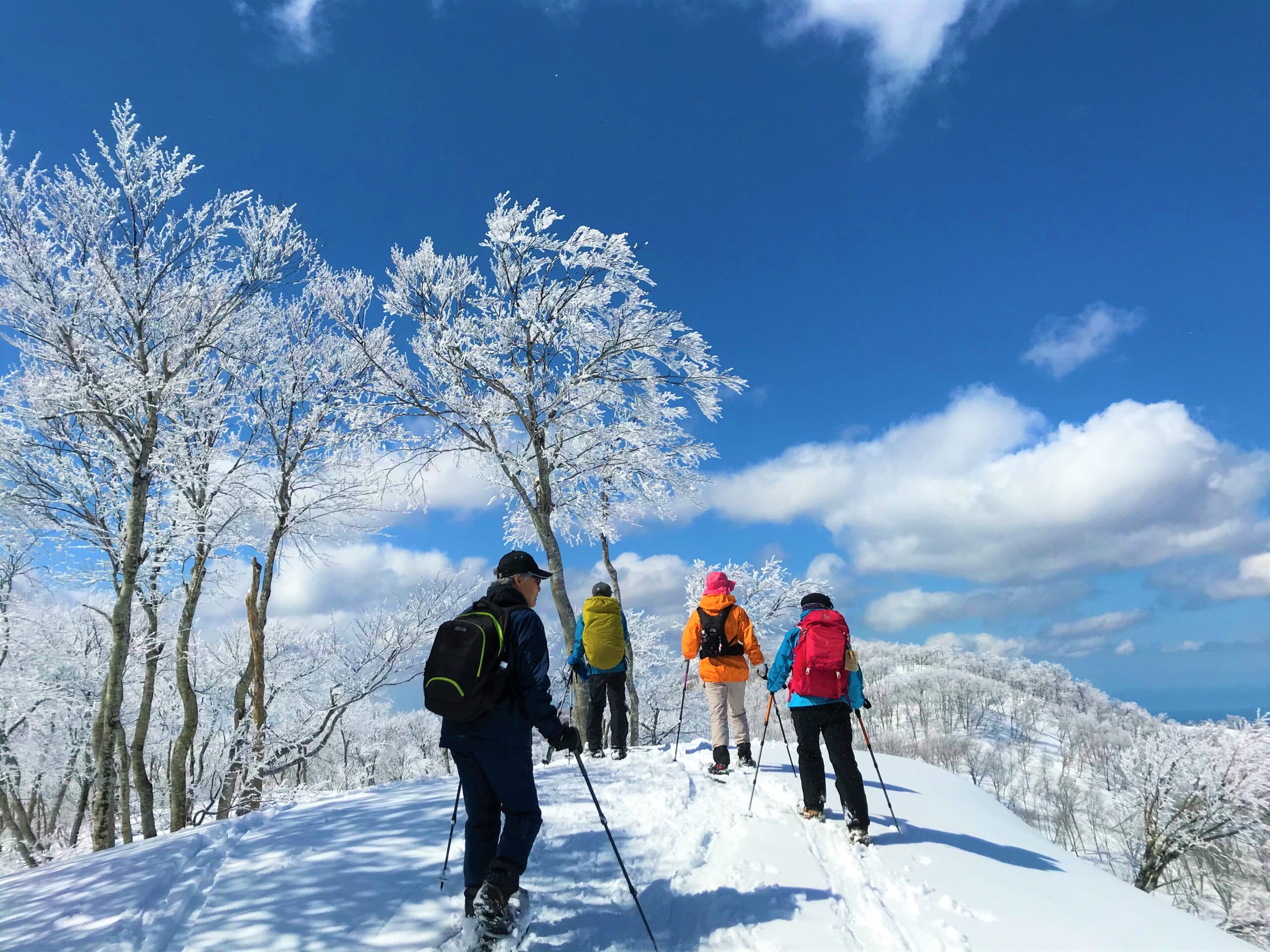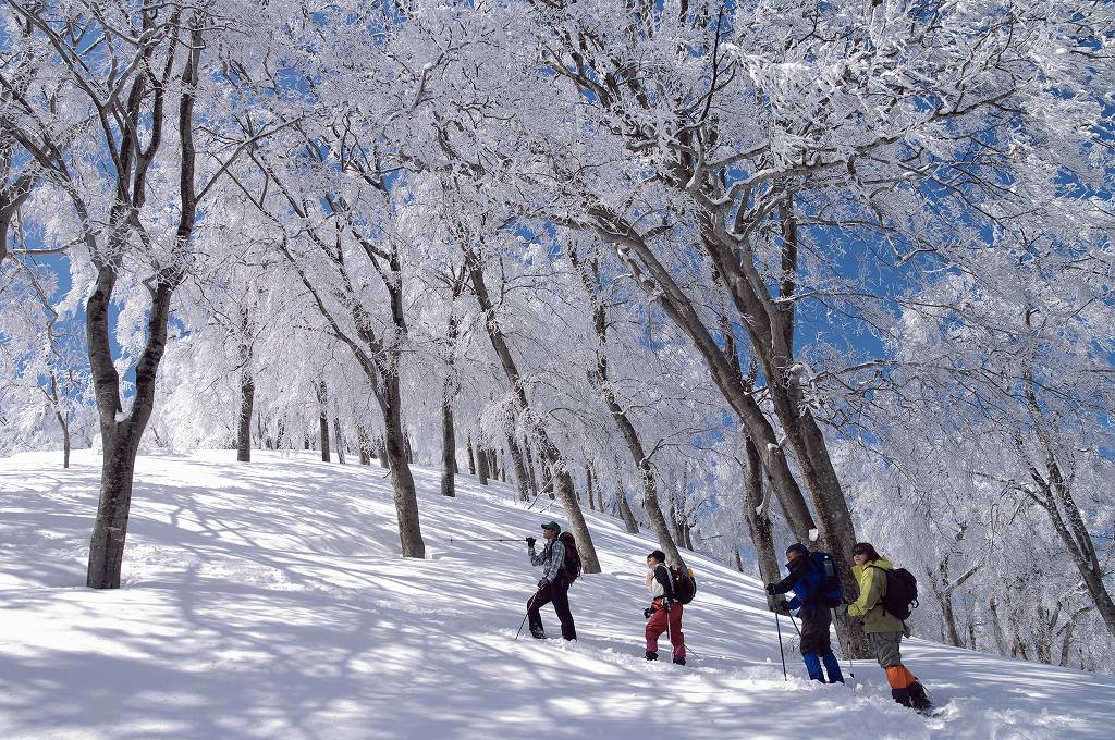 なべくら高原の最高峰「鍋倉山」の登頂を目指すツアーです。「巨木の谷」と称される中腹エリアには、平均樹齢が100年を超える巨老ブナ達が今もなお雄々しく群生しており、標高1,288m地点に位置する山頂の最大積雪量は、厳冬期では8mに達することも。夏山との差が顕著に表れるのも、雪深い地域の中山ならではの面白さといえます。