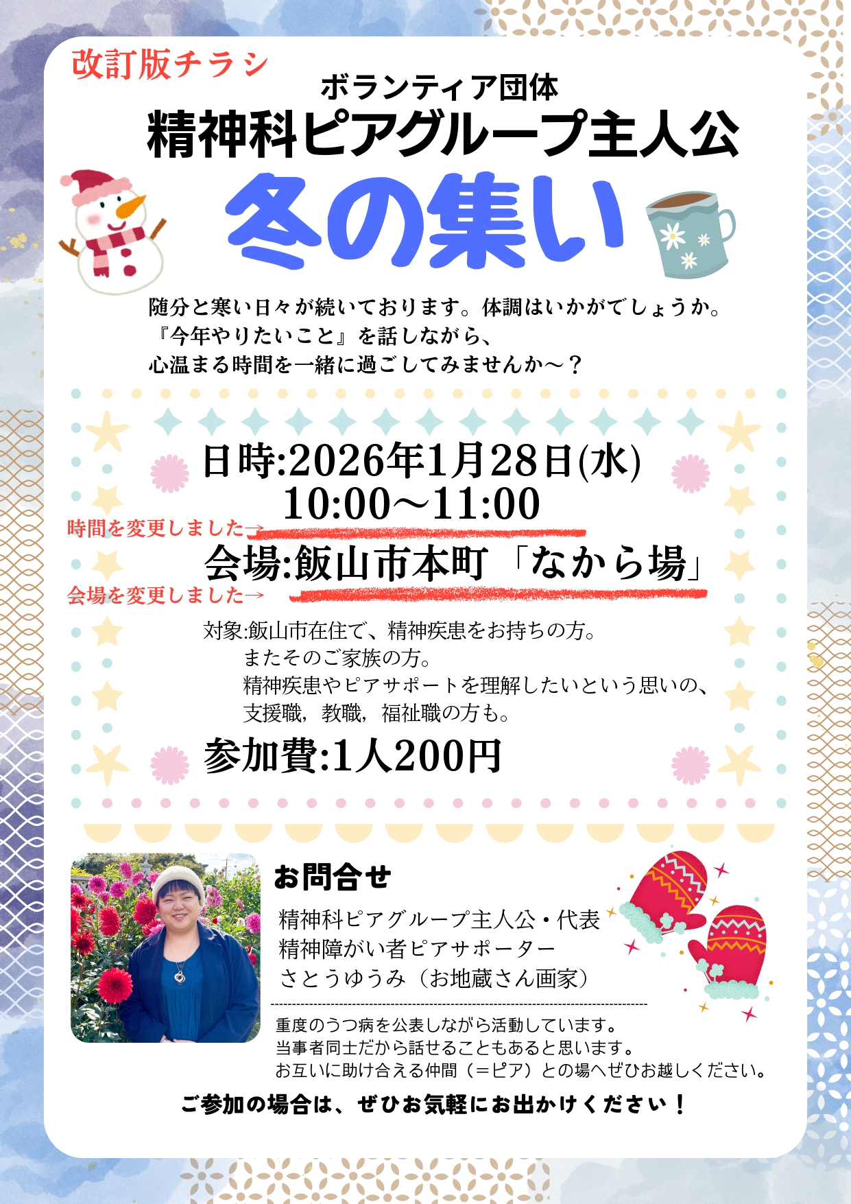 飯山市在住で、精神疾患をお持ちの方、またそのご家族を対象に、”冬の集い”を開催します。